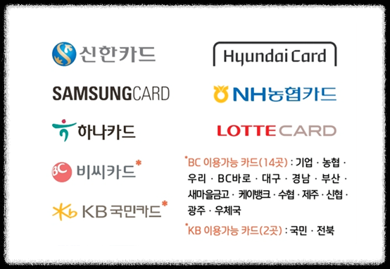 - 광주은행·부산은행 ·NH농협 ·수협 : (법인카드, 공무원 복지카드) 자사 카드만 가능